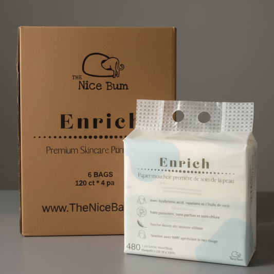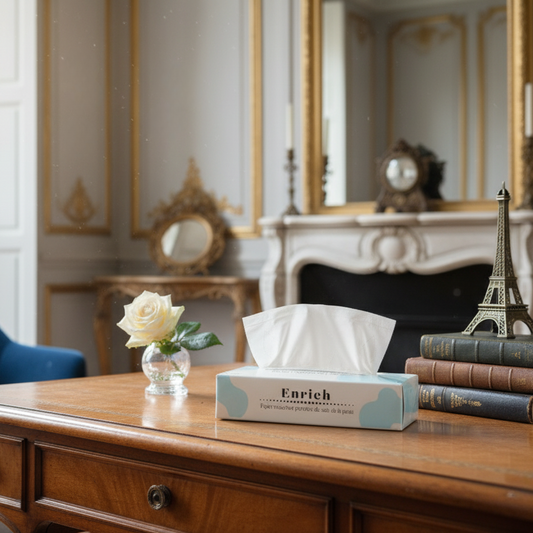 Discover premium 3-ply facial tissues made with plant-based fibers. Enrich delivers zero dust, buttery softness, and gentle strength — perfect for sensitive skin and everyday comfort.